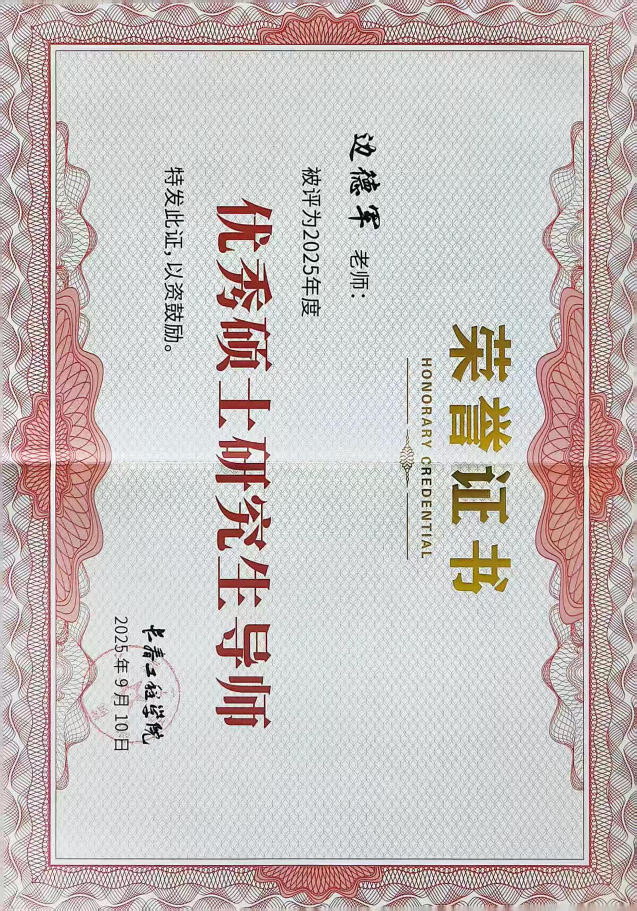 实验室主任边德军教授获“2025年度优秀硕士研究生导师”。